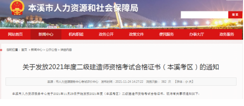 11月23日,辽宁盘锦市人事考试网发布了《关于2021年度二级建造师考试合格证书发放通知》,定于2021年11月25日开始发放2021年二级建造师考试合格证书。